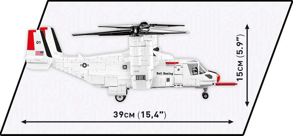 The COBI model of the Bell-Boeing V-22 Osprey was released under the license of the American manufacturer of combat helicopters, Bell Helicopter Textron. Developed in 1:48 scale to match the rest of the Armed Forces collection, the model consists of 1136 elements and includes two figures depicting the first test pilots in distinctive uniforms. The length of the model is 390 mm, the width is 500 mm! Completely new elements have been developed for the set, which make our model even better! Numerous detailed prints capture the look of the signature test paint. The most important functionalities of the model are the drive nacelles, which can be set in different positions, rotating rotor blades, opening cabin doors with stairs, access to the cockpit and the possibility of placing figures there, and an opening rear loading hatch.