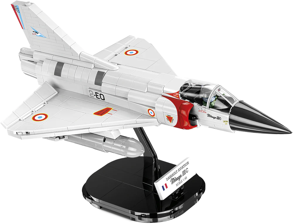 We at COBI released the Mirage IIIC model in 1:48 scale under the original license from Dassault Aviation. It was developed entirely from 436 COBI building blocks and is intended for both play and display. The design of the aircraft has been improved in relation to the previously released Mirage 2000. Due to the detailed reproduction of even the smallest details, it will be a great decoration for any collection of military enthusiasts and modern military aviation. Only high-quality, durable prints were used in the model. The plane has many movable elements such as wheels that can be folded up, ailerons, an opening pilot's cockpit and finally weapons. The set includes a special pilot body that can be placed in the cockpit. The set also includes a special display stand and a plate with the name of the set.