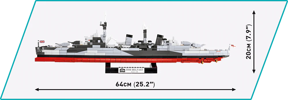 The COBI company, as part of a prestigious cooperation with the IMW (Imperial War Museums), has prepared a model of the historic British cruiser HMS Belfast. The ship was designed on a scale of 1:300 and faithfully reflects the details of its historical inspiration. The light cruiser is 64 cm / 25.2" long and 19.5 cm / 7.7" high. It has many movable elements, such as deck guns, rotating artillery towers, rudders and propellers. The model has been covered with high-quality prints representing equipment and camouflage. Prints do not rub off even during intensive use. The set includes a black display stand and a white plate with the name and scale of the model printed on it. The plaque also features the IMW (Imperial War Museums) logo. The Belfast will make a perfect gift for all lovers of history, military and marine science. It will also look great on a desk, bookshelf or on a shelf with souvenirs. Build history, piece by piece, with COBI.
