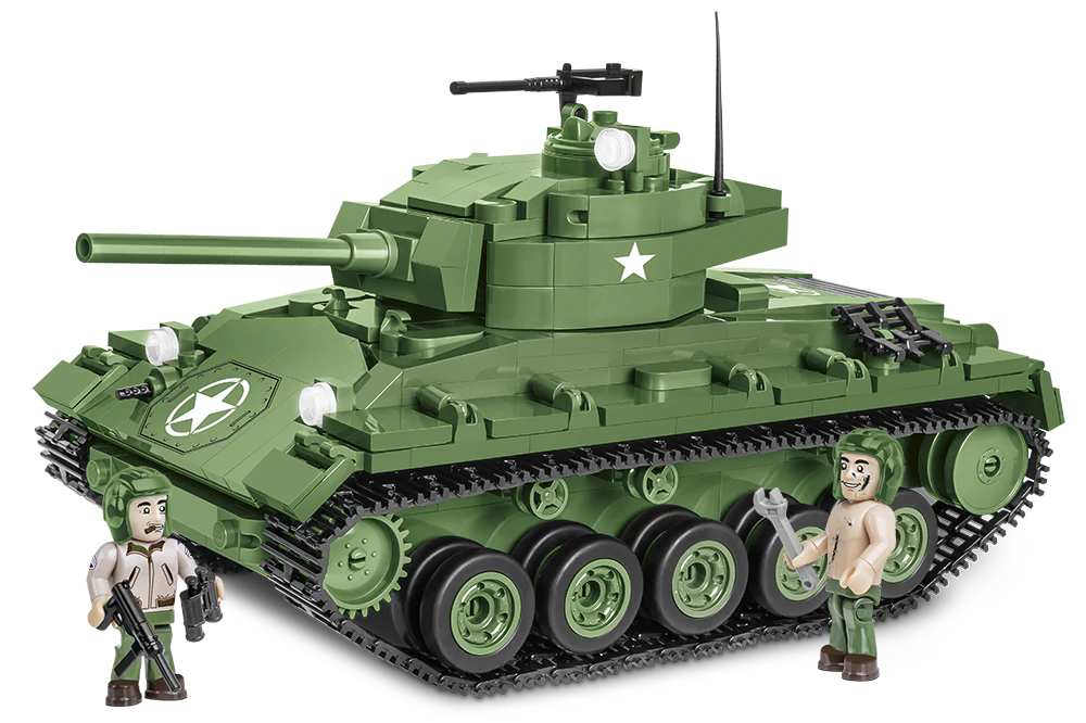 From 588 COBI building blocks you'll build a perfectly designed model of the M24 Chaffee light tank. The model has working crawler traction, a rotating turret and a movable barrel. Under the opening service flap you’ll find two brick-built engines. On the turret there is an opening hatch and a machine gun. On the model are extremely durable prints that do not scratch or smear, even during intense play.