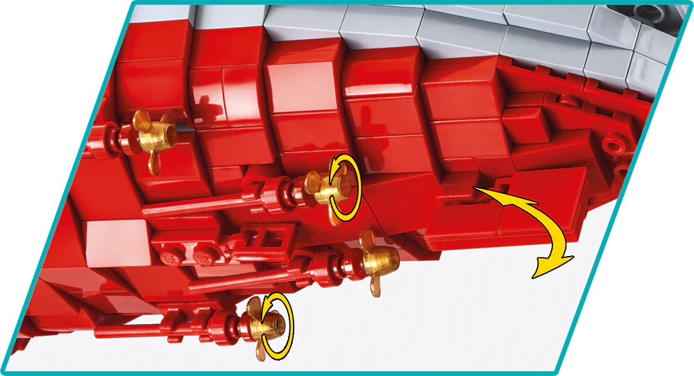 The battleship Yamato is a huge model made of COBI construction blocks. Like other warships, it was designed in a model scale of 1:300. The latest edition even more faithfully reflects even the smallest details and details of its historical prototype. After assembling 2665 elements, the battleship's body is as much as 90 cm (30.4") long and 19.5 cm (7.7") cm high. It has many moving elements such as: on-board guns and anti-aircraft batteries, rotating artillery towers, rudder or propellers. The set comes with a special display stand with a plate on which the name of the ship is printed. A beautiful addition is a unique brick imitating the Golden Orchid, which is an imperial symbol that decorated the bow of the ship. The model is ideal for all lovers of history, military, marine and military technology. It looks great, arousing admiration and interest! Thanks to the intuitive instruction based on clear icons, the construction is simple and does not cause difficulties. The estimated construction time of the model is about 8 hours.